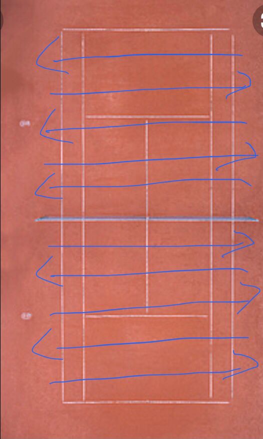 Ganz wichtig ist, dass der Platz immer parallel zum Netz abgezogen wird (siehe Bild). Bitte benutzt auch die Linienbesen, um die Linien sauber zu halten.